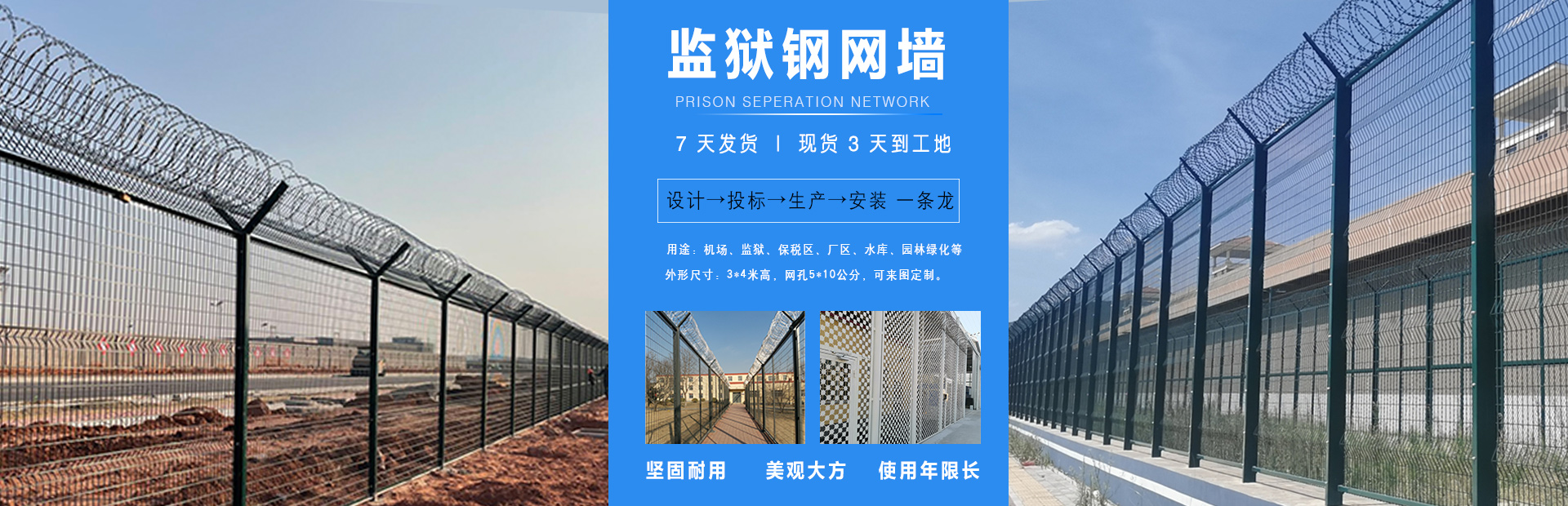 公司主營產品:監獄防爬隔離網、監獄鋼網墻、梅花刺隔離網、358防爬密文網、監獄刀片刺網、公路護欄網、機場鋼筋圍界、球場圍網、圈地護欄網、鐵路防護柵欄、小區防護網等。